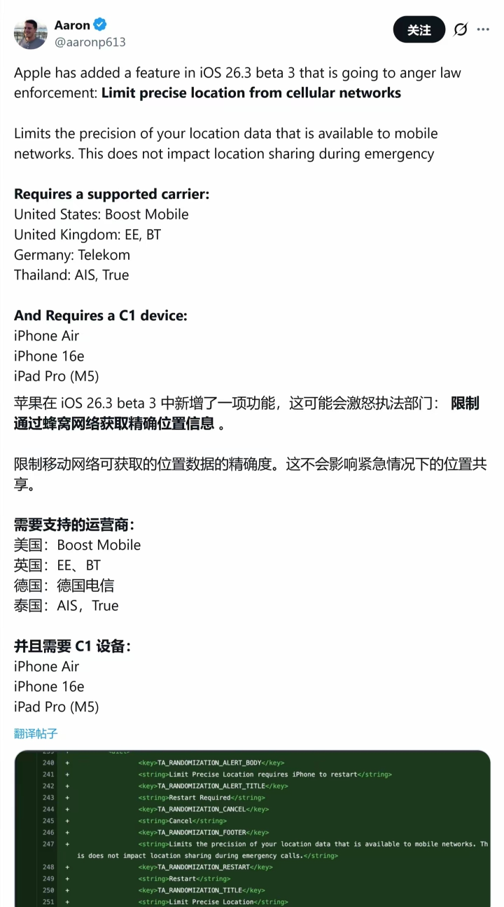 总结来说,iOS 26.3新增的限制蜂窝网络精确位置功能,没有花哨噱头,却精准解决了用户的隐私痛点,把位置数据的控制权真正还给了用户。虽然目前仅在特定地区上线、机型限制也较多,但这无疑是苹果在隐私保护上的又一务实升级。你期待这项功能早日在国内上线吗?